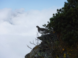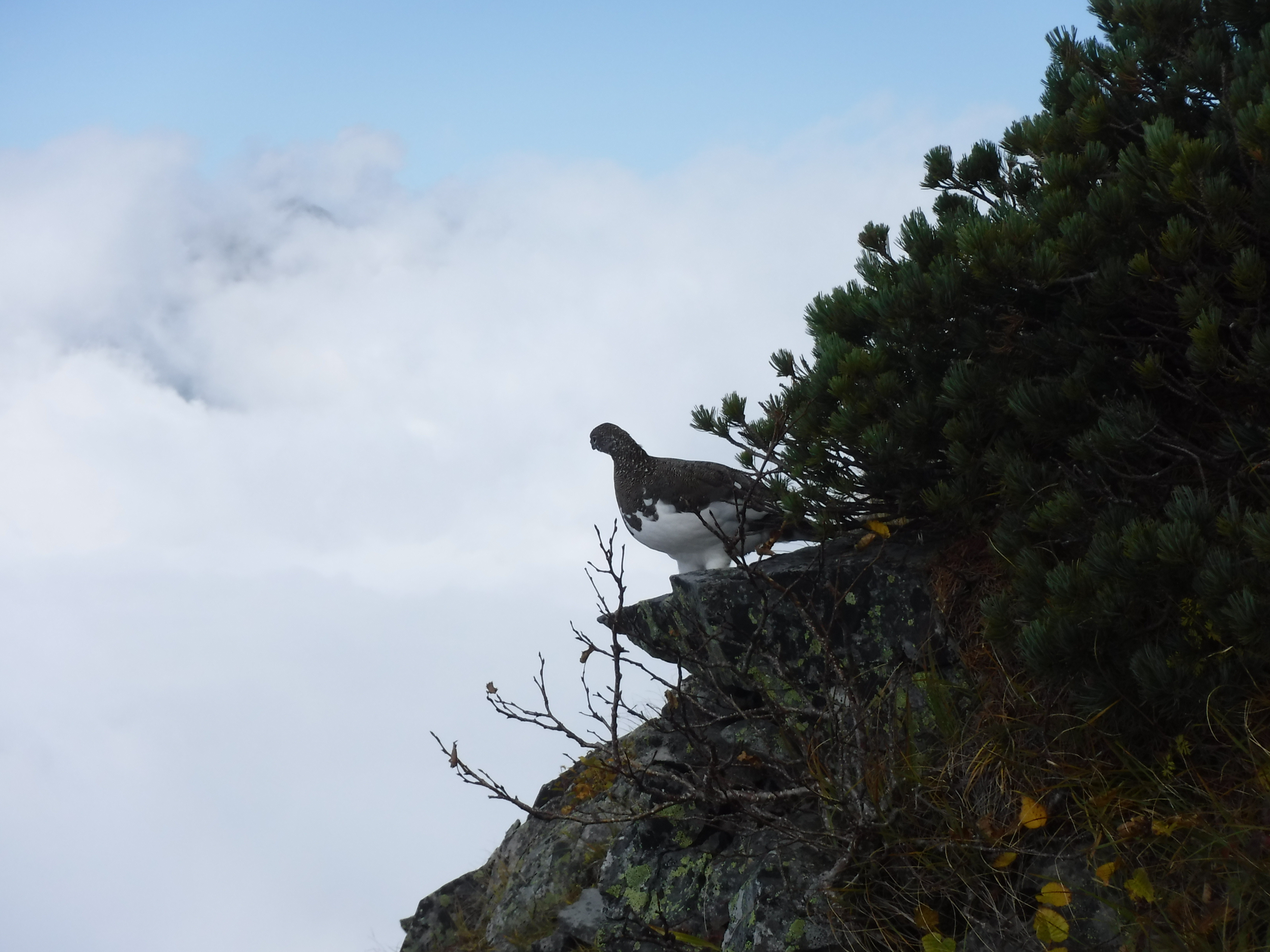 帰り、西穂独標あたりでライチョウが現れました。だんだんと冬支度を始めているようで白い羽に替わってきています。 |