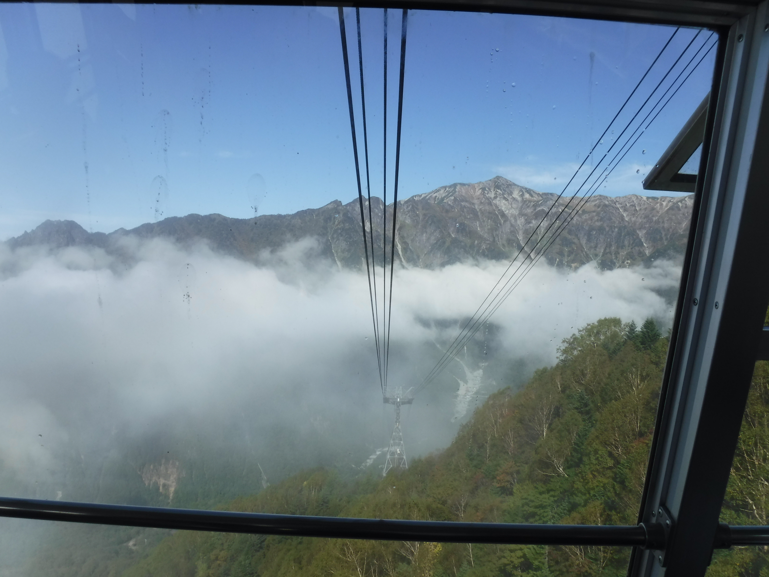 9:30頃のロープウェイに乗ることができました。後ろの正面は笠ヶ岳です。 |
