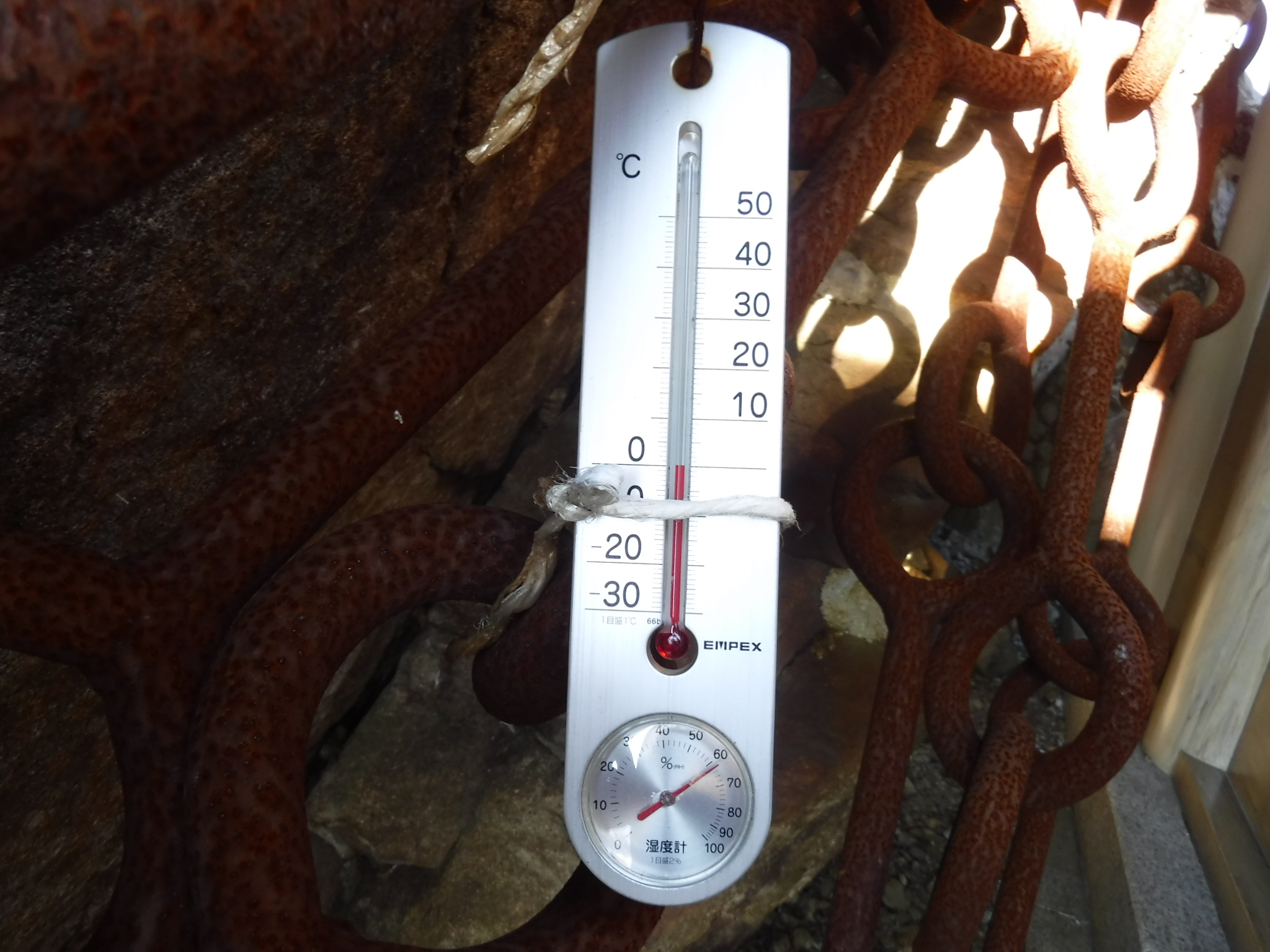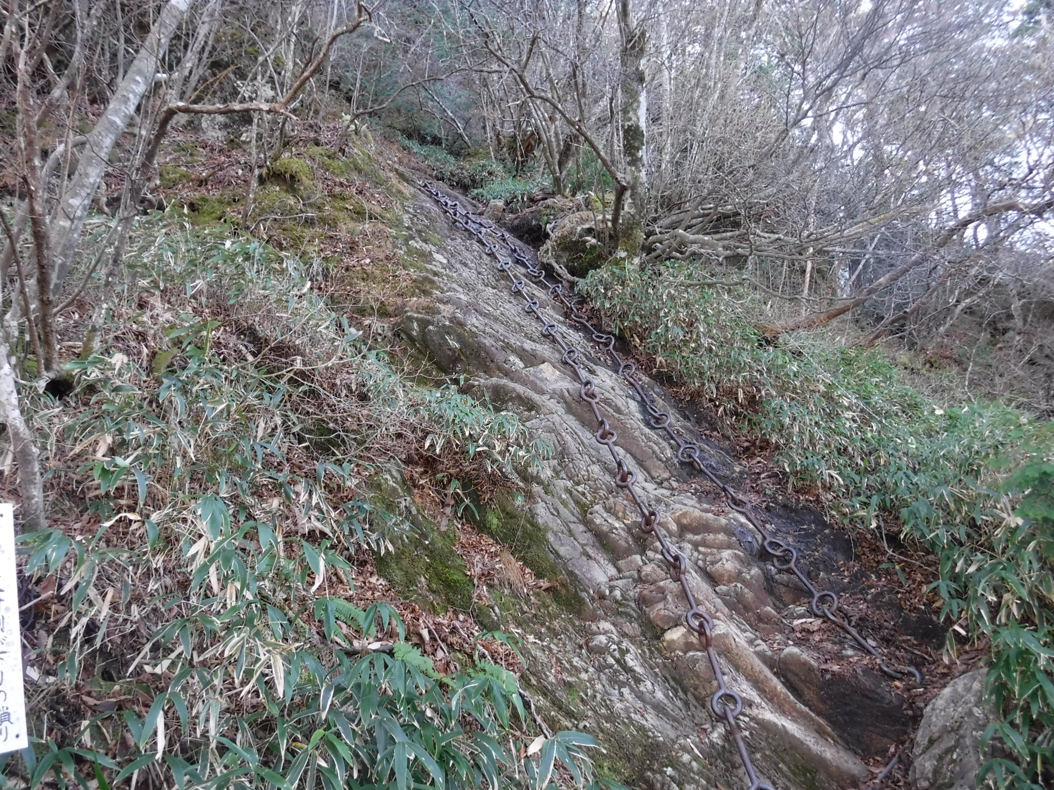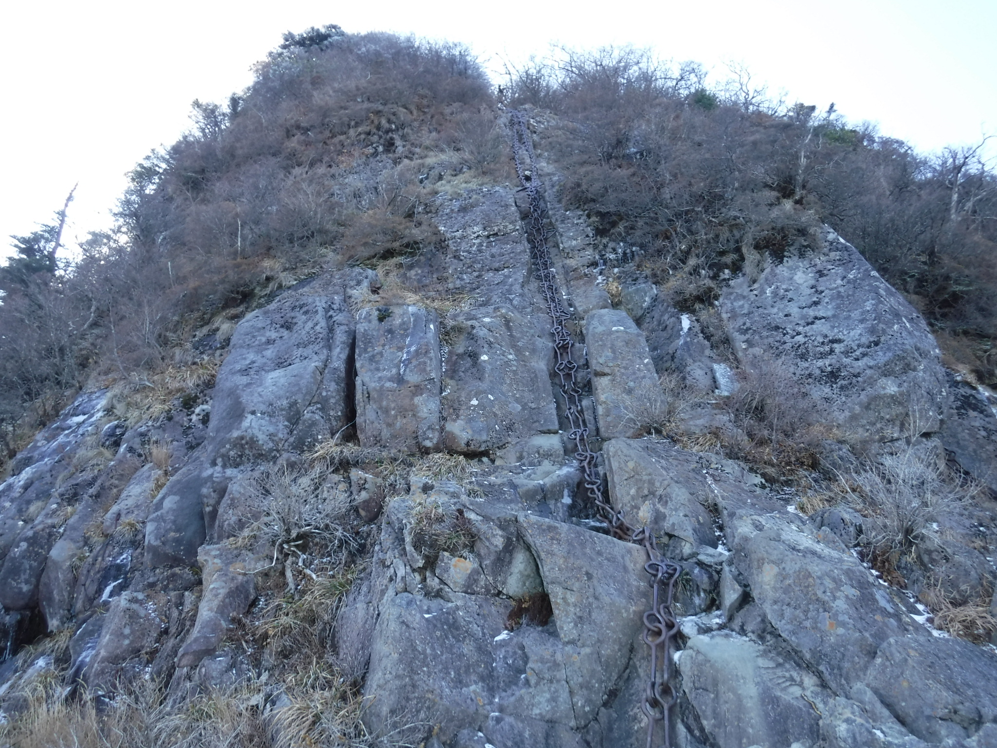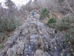 ここの鎖、とにかくデカイ!こんなでかくて太い鎖は初めてです。ちょっと登ったらいきなりズルッ・・よく見たら足元の岩が半分凍ってます。 凍っていないところを選びながら慎重に登っていきます。 |