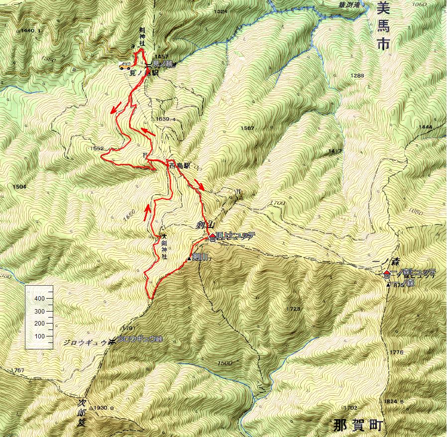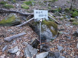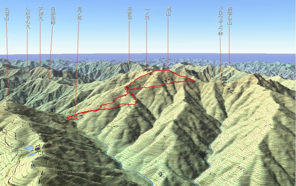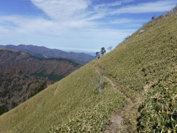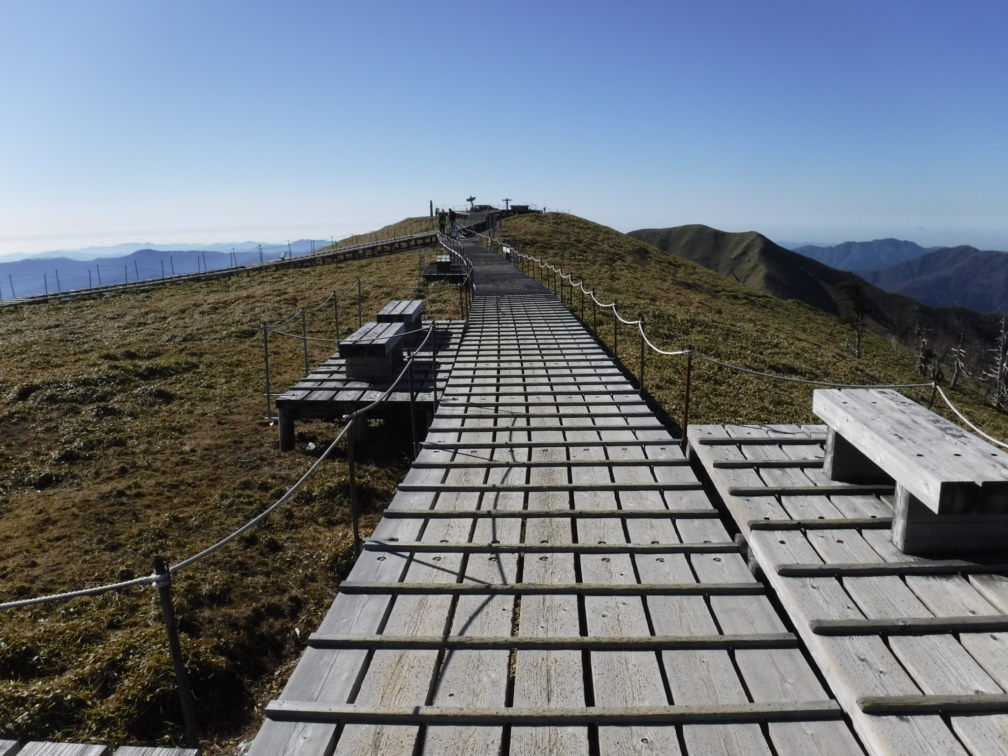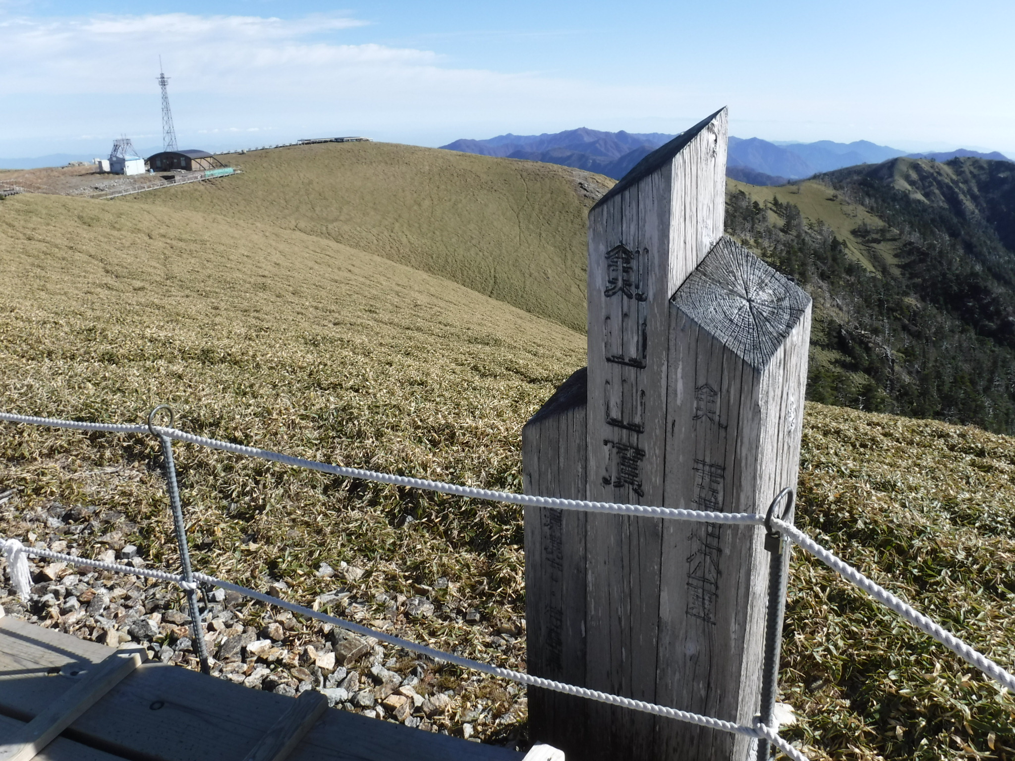 正面に見えるのは次郎笈(ジロウギュウ)なかなか読めません。今回は登りませんが途中までここの尾根を下ります。 |