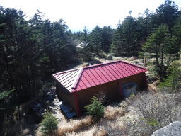 岩場から見た山頂です。手前が山小屋で奥がトイレになっています。 |