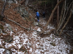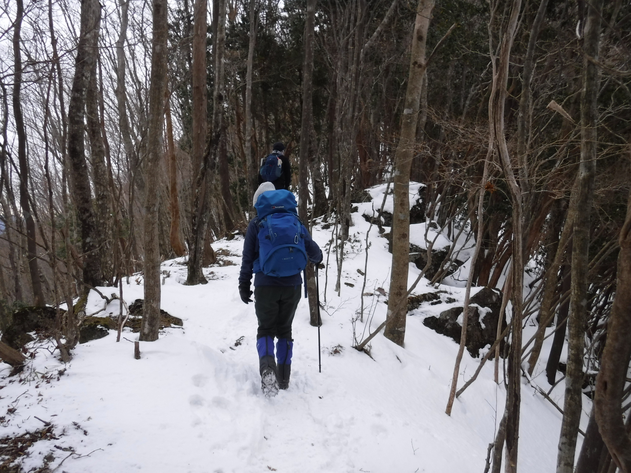 尾根に出ると一気に雪が増えてきます。積雪20cmってとこでしょうか。 久々にみる雪でおっさんたちも大喜び。 |