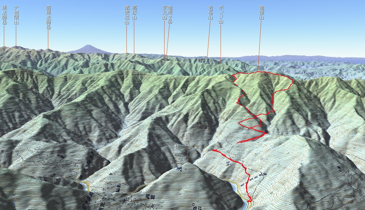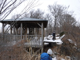 あずまやからは遠く富士山や伊豆半島、手前には岩岳山や竜馬ヶ岳が良く見えました。 |
