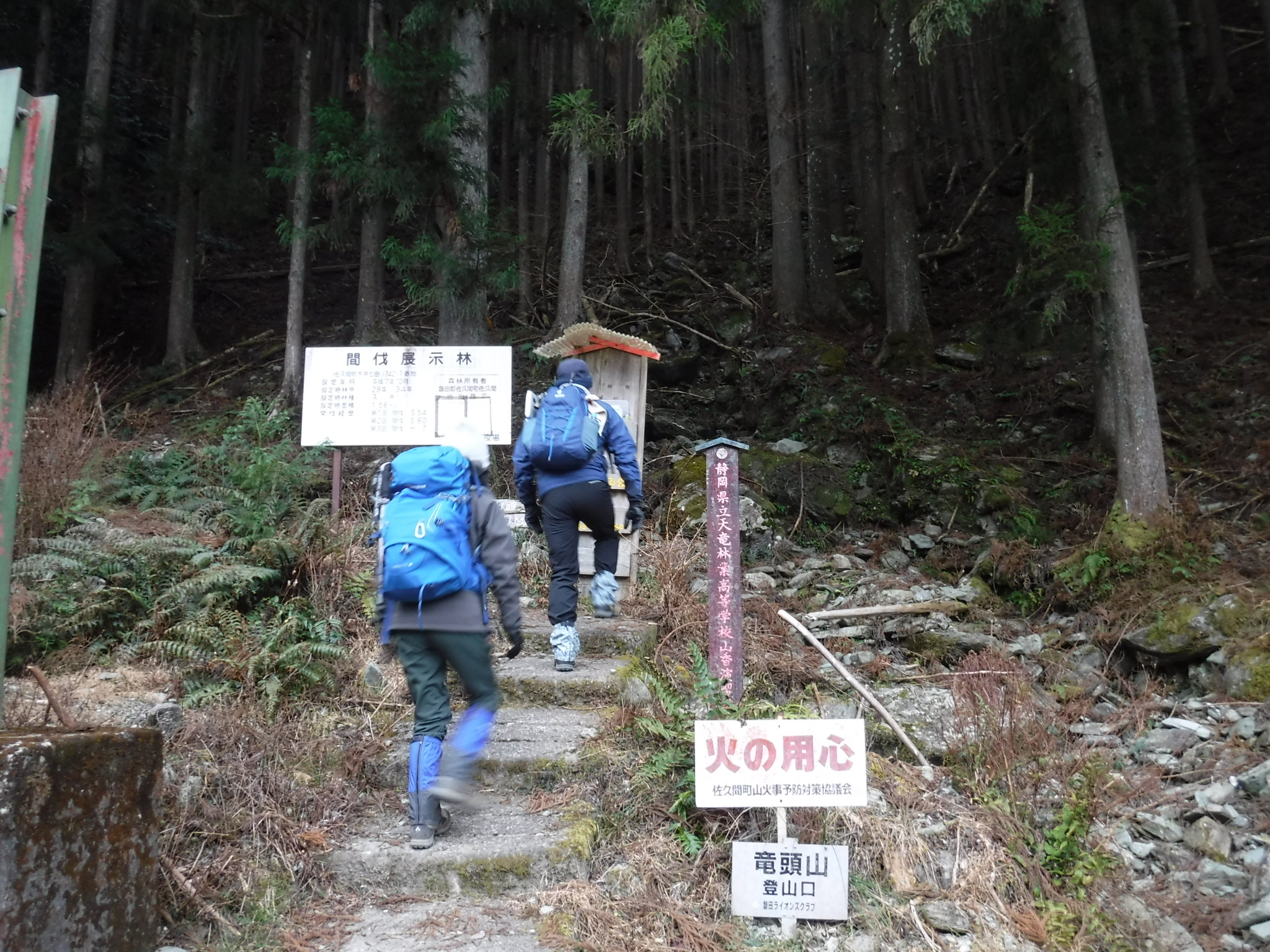 駐車場横の登山口です。ここの標高は130mほど、山頂まで1,200m登ることになります、頑張りましょう。 |