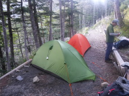 山頂付近でしばらく山の風景を楽しんだ後は、途中でテントを回収し同じルートを下山しました。問題の自転車漕ぎ、登りよりはだいぶ楽でしたが辛いものがありました。 |