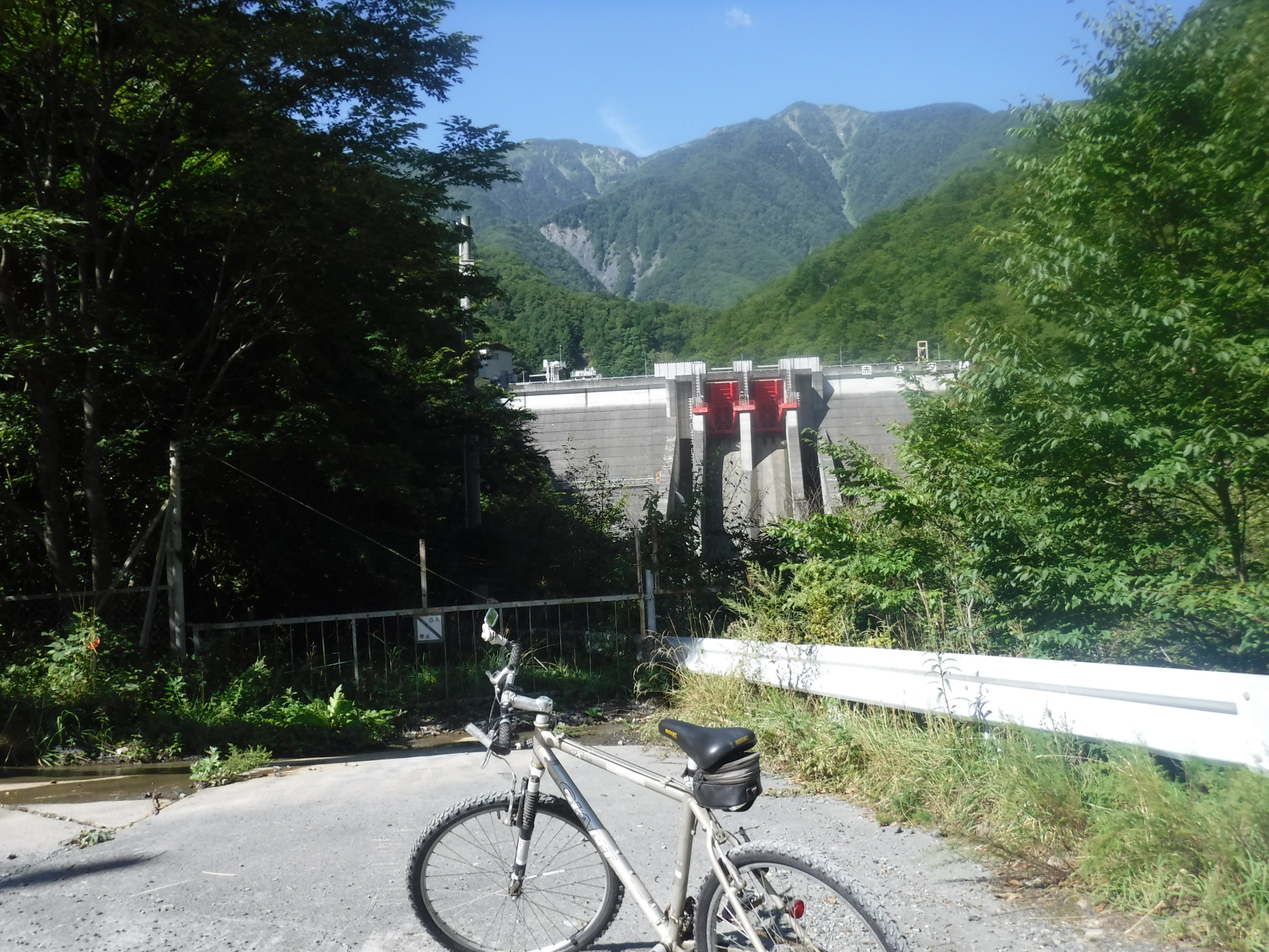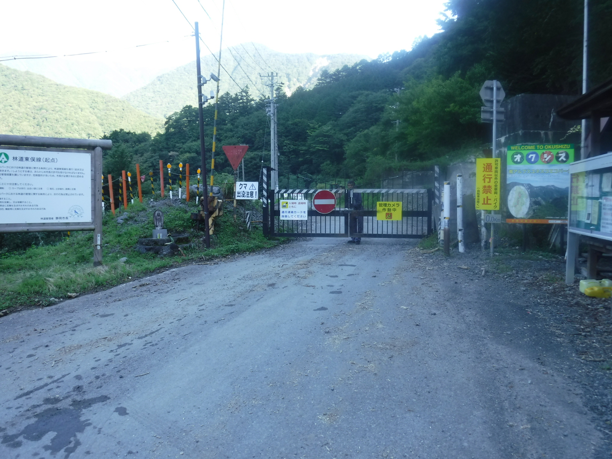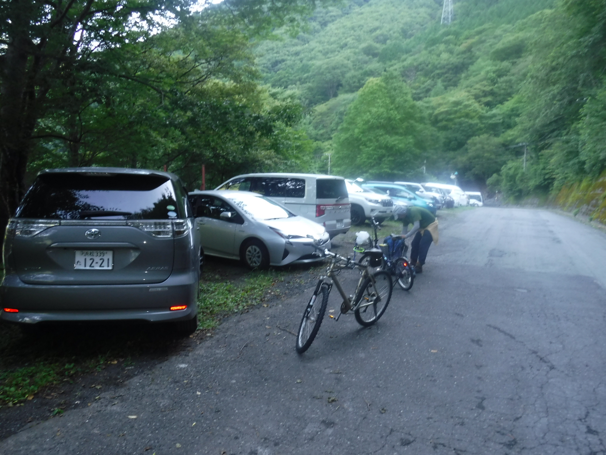 朝7時、畑薙第一ダム横の駐車場に到着しました。ガラガラかと思っていましたが、結構な数の車が止まっています。チャリを車からおろしてゲートに向かいます。 |