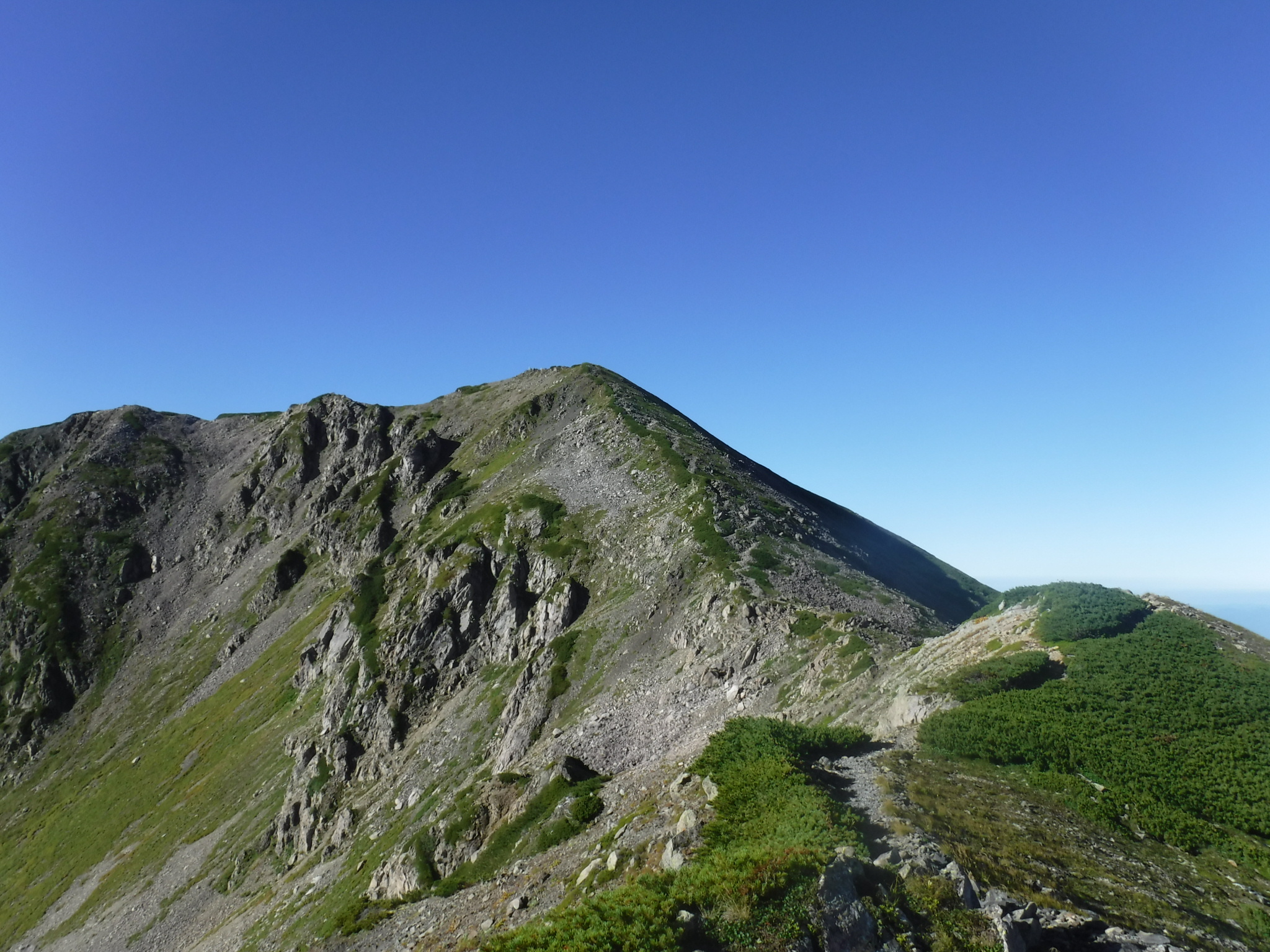 稜線に出ました。風が急に強くなりましたが一気に視界が広がります。山頂まであと少し。 |