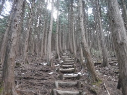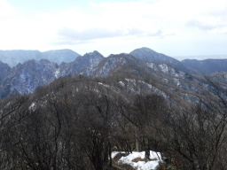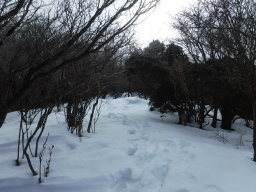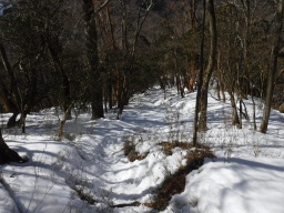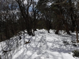 尾根に出ると急に雪が多くなってきました。でも凍ってもなく、ぐちゃぐちゃでもなく歩きやすい雪です。 |