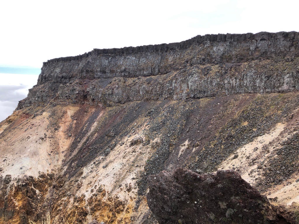 山頂は風が強く寒かったので夏沢峠へ下って昼飯にすることにしました、その途中から見える火口です。 |