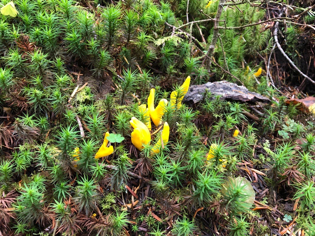 コケの中になにやら奇妙な黄色いキノコが生えてました。 |