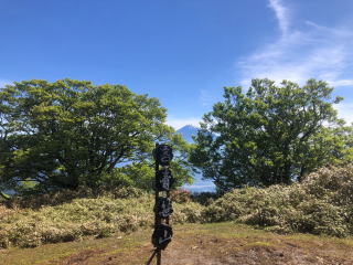 ちょっと行くと目的地の青笹山に到着します。木の間にちょこっと富士山が見えます。 |