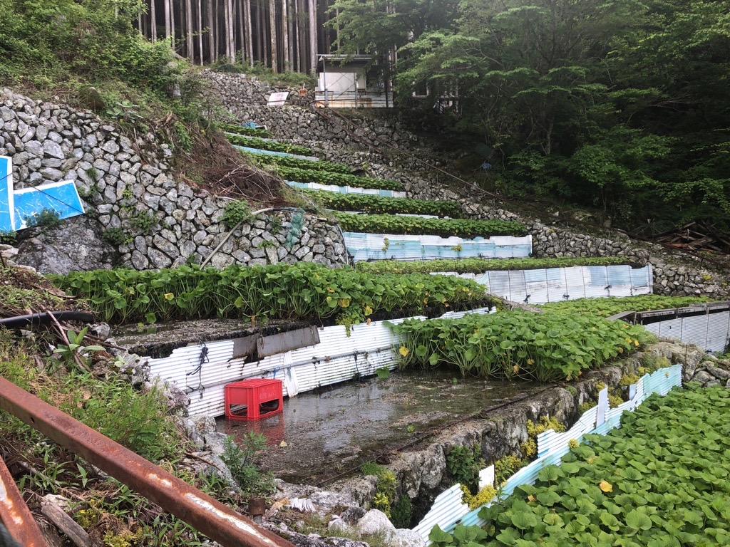 しばらく登るとワサビ田が広がっています。ワサビの根っこは冬が旬で、今は茎の旬見たいですね。 |