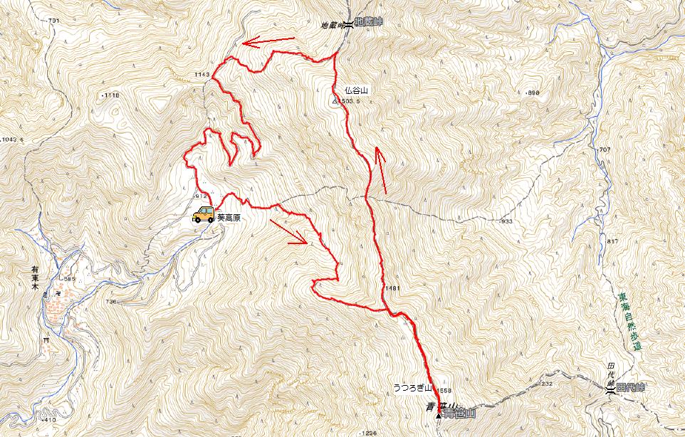 行程 :葵高原登山口07:20 〜 09:00青笹山09:40 〜 地蔵峠11:10 〜 葵高原登山口11:45