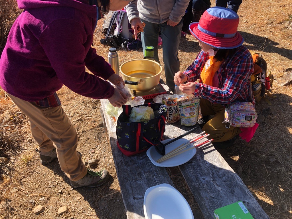 総勢9名の大人数になりました。それぞれ、食材担当やガスコンロ担当、おやつ、コーヒー担当に役割分担して行ってきました。寒波が襲来して来ていましたが、ダイラボウはポカポカ陽気で、のんびりと鍋を楽しむことができました。やっぱり山で食べる物は何でもおいしいですね!
