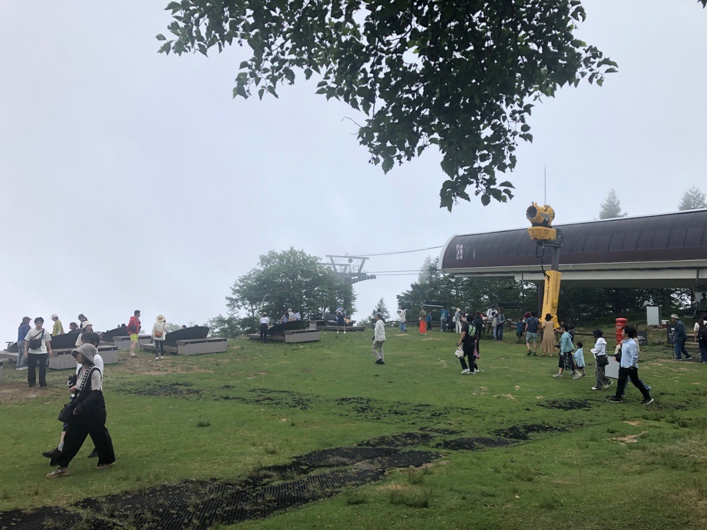 下山途中にリフト山頂駅に寄ってみました。ガスガスで展望がないのに大勢の人でにぎわっています。 |