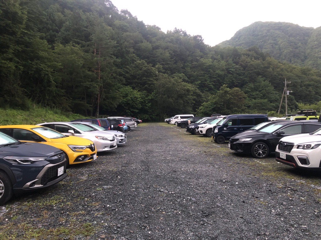 奈良田の駐車場、5時前に着きました。平日なのに車は8割ほど入ってました。 |
