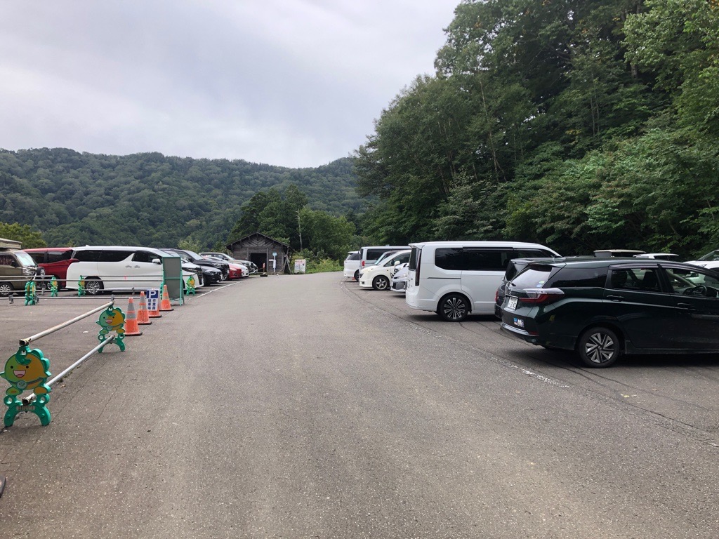 くねくねした林道をしばらく走り、蓮華温泉駐車場に到着。広いようですが車もたくさん停まっていました。蓮華温泉ロッジ裏の登山口から出発です。 |
