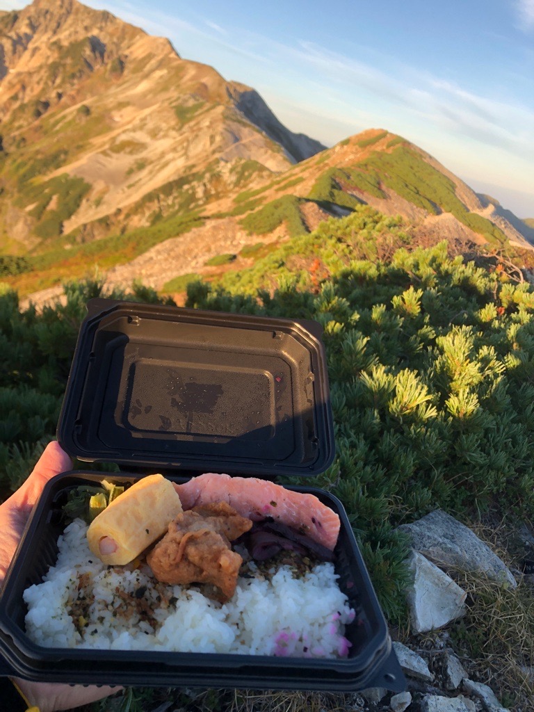 途中で朝弁当を食べました。昨夜冷えたので御飯が硬い、でも旨かったです。 |