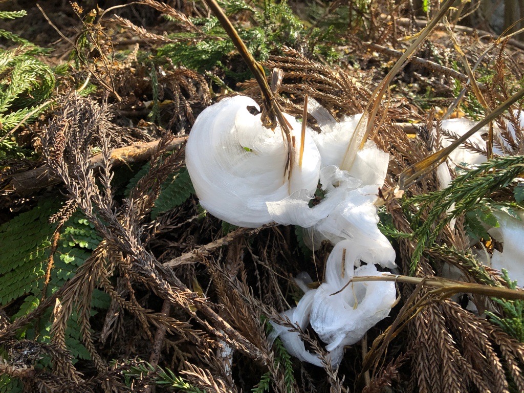 後で調べたところ、枯れた草木の茎の内部の隙間を、毛細現象で地面から水分が上がってきて、凍ったものだそうで、氷華とか霜の花と呼ぶみたいです。 |