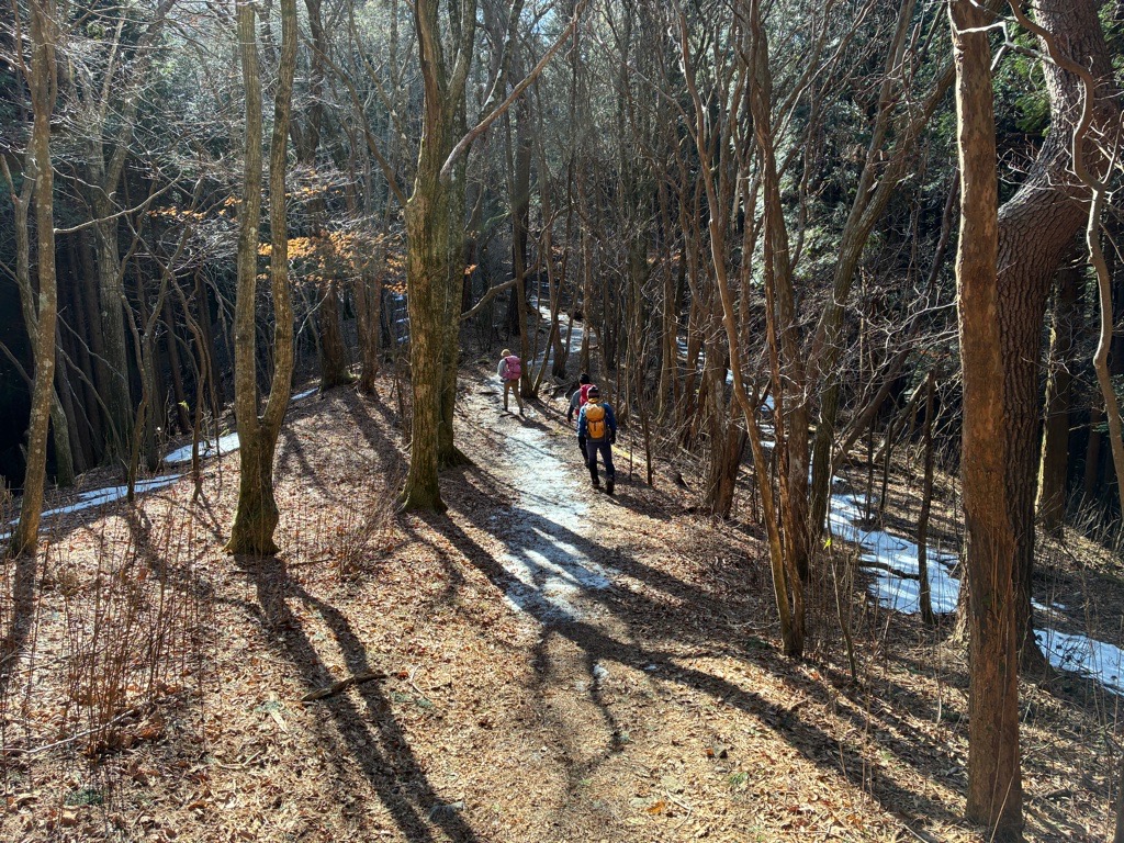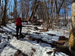 山頂付近は多少雪が残っていました。雪というかほとんどアイスバーンです。帰りは危ないのでチェーンスパイクを履きました。 |